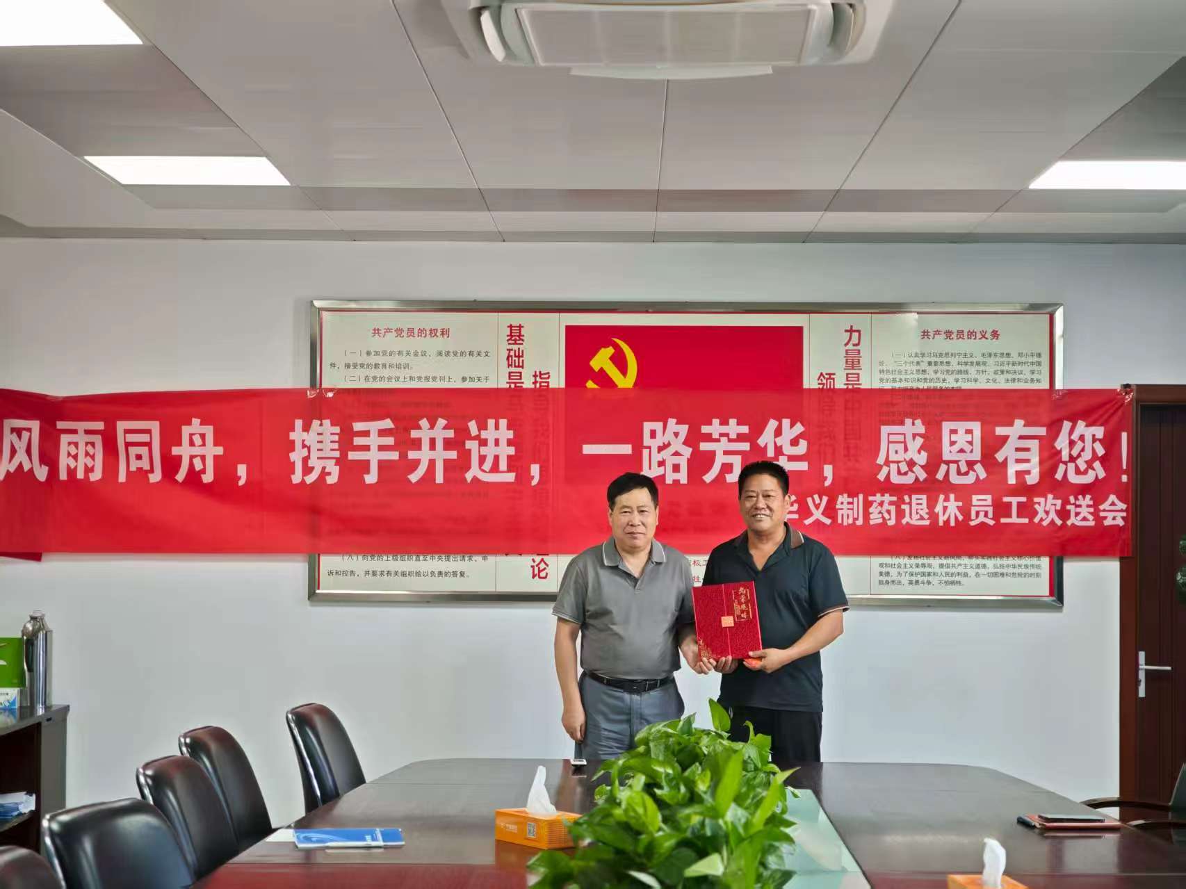 在2025年9月22日下午,華義制藥迎來今年第四次退休員工歡送會,退休員工是合成車間的楊可榮同志。楊可榮同志于2000年11月進(jìn)入華義工作,至今已近25年,期間一直在車間工作,是車間較早一批員工之一,并在2024年度榮獲“先進(jìn)員工”光榮稱號。